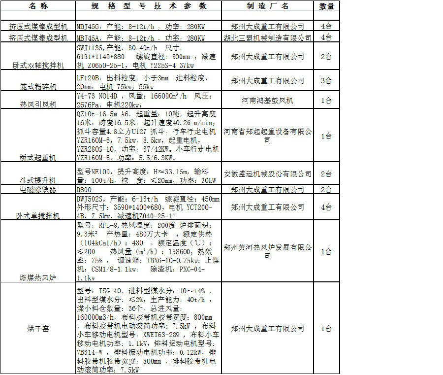 安徽晋煤中能化工股份有限公司拟处理一批型煤装置闲置设备,包括烘干窑、挤压式煤棒成型机、卧式双轴搅拌机、卧式单搅拌机、桥式起重机等,详情如下: