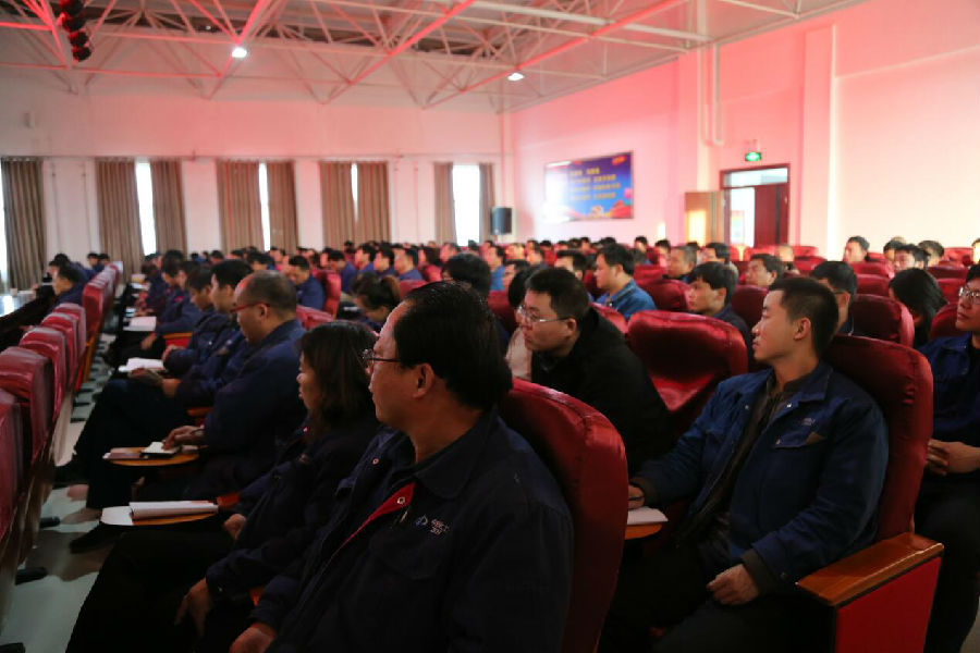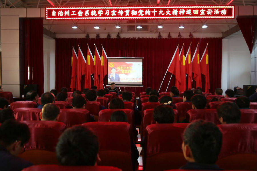12月10日下午17:00,新疆昌吉州工会系统学习宣传贯彻“党的十九大精神”巡回宣讲团走进新疆中能公司。公司全体党员、中高层管理人员、部室员工、生产系统不当班的操作人员共150余人统一着蓝色工装,精神抖擞地齐聚综合楼五楼会议室。活动由公司副总经理葛超伟主持。